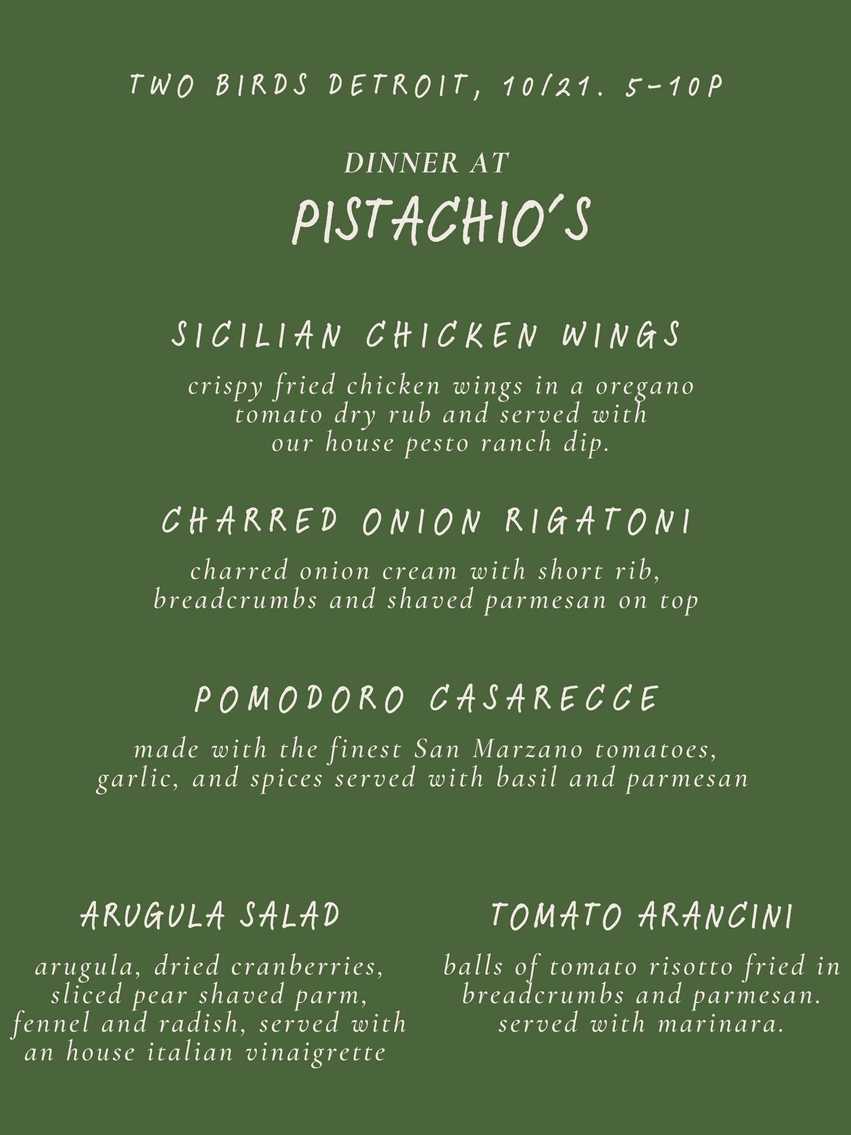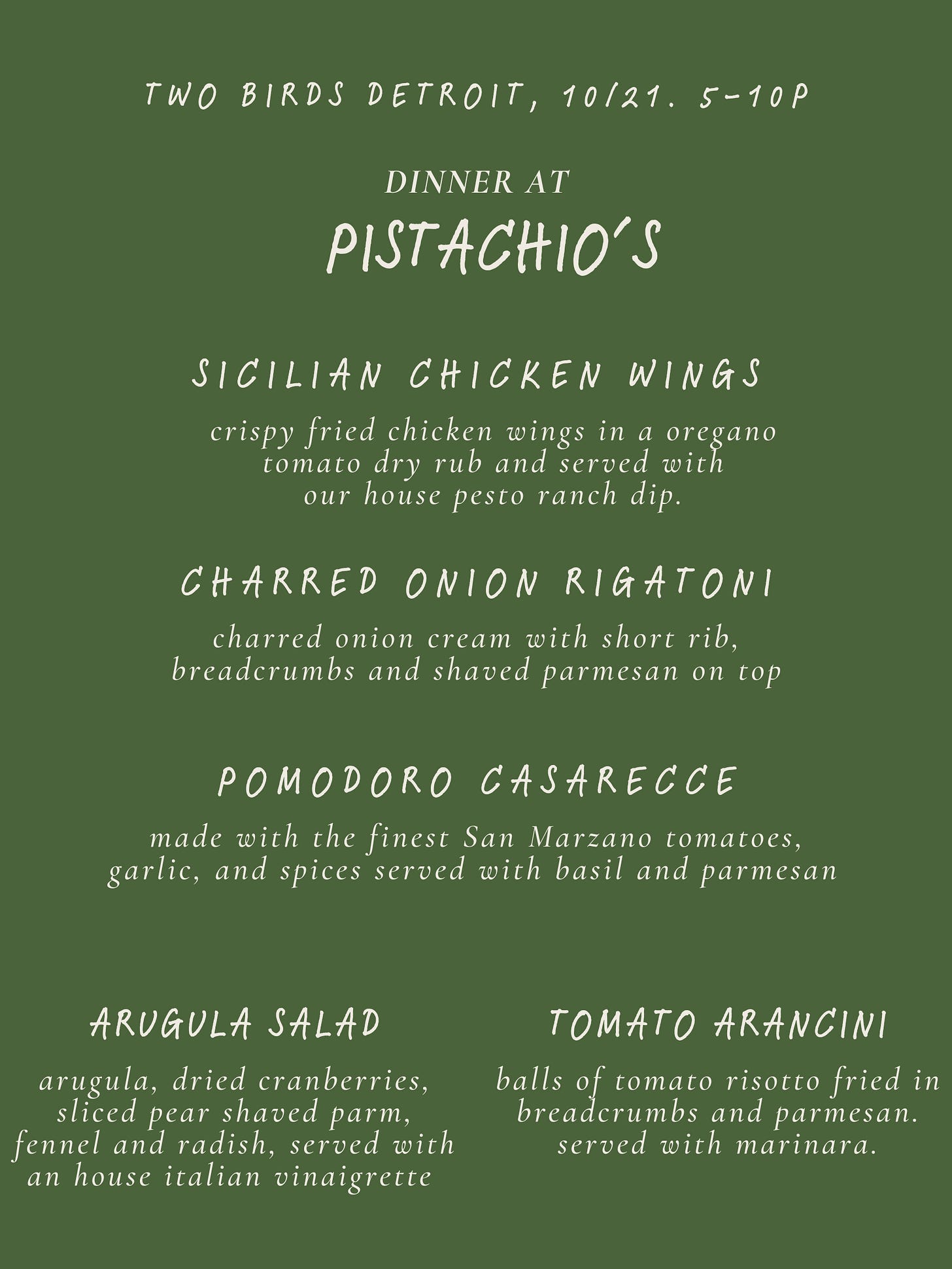 Dinner at Pistachio'sits been a minute but food is here! come check out our newest pop-up concept! Elle, the FoodieOct 20, 20251ShareJohn and I are popping up at Two Birds this Tuesday (5-10pm). We’ll be serving fresh pasta, Sicilian chicken wings, and tomato risotto arancini. See you soon!Dinner at Pistachio's
